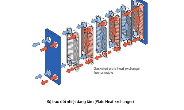 Bộ trao đổi nhiệt dạng tấm (Plate Heat Exchanger) gồm nhiều tấm kim loại mỏng được xếp chồng lên nhau. Hai môi chất nóng – lạnh chảy xen kẽ qua các kênh giữa các tấm, trao đổi nhiệt trực tiếp qua bề mặt tấm.